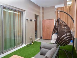 The air-conditioned unit includes one bedroom with windows facing the garden and access to both a terrace and an outdoor balcony offering garden views. The living area incorporates a fully equipped kitchen for cooking and food storage, while entertainment is provided by a flat-screen TV.