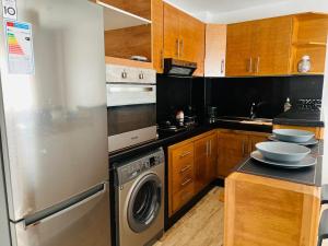 The apartment features one bedroom and accommodates two beds. The living area includes a flat-screen TV, while the separate kitchen provides facilities for cooking and food storage. A washing machine is also available within the unit for added convenience.