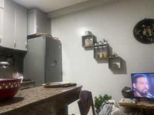 The apartment contains one bedroom and one bathroom, furnished with four beds. Entertainment is available via a flat-screen TV, while guests can use the washing machine for laundry needs. The kitchen allows for cooking and food storage during the stay.