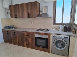 The apartment features three separate bedrooms and two bathrooms equipped with walk-in showers. The living area includes a flat-screen TV with satellite channels and free Wi-Fi throughout the property. Guests can prepare meals in the fully equipped kitchen that contains an oven, stovetop, refrigerator, and kitchenware. Additional conveniences include a washing machine, coffee machine, ironing equipment, and seating area overlooking quiet street views.