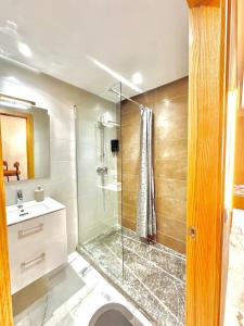 This one-bedroom apartment includes air conditioning, soundproofing, and a kitchen equipped with a refrigerator, oven, microwave, and coffee machine. The living area offers a flat-screen TV with satellite channels alongside seating for relaxation. The bathroom contains a walk-in shower and bidet. Guests benefit from feather, synthetic-fill, hypoallergenic pillows as well as slippers provided in the sleeping area.