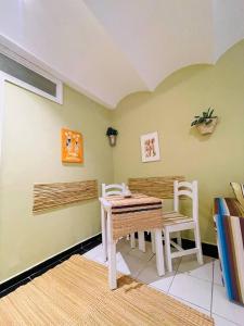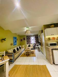 The apartment features a fully equipped kitchen with a stovetop, microwave, refrigerator, and kitchenware alongside a dining area where guests can enjoy meals. The living space includes a seating area and a TV for entertainment. The bathroom contains both a shower and bidet to meet guest needs.