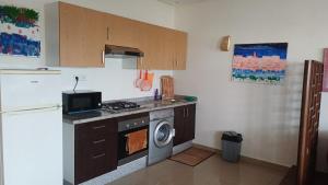 The spacious one-bedroom apartment provides city views and includes a fully equipped kitchen with an oven, stovetop, refrigerator, microwave, and kitchenware. The living area contains a flat-screen TV with satellite channels and seating space. A washing machine and kettle are also available for guest use. The private bathroom offers either a bathtub or shower along with soap and a hairdryer.