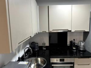 Inside the one-bedroom unit, guests can enjoy a fully equipped kitchen with an oven, stovetop, refrigerator, microwave, and kitchenware. The living area includes a flat-screen TV and free Wi-Fi throughout the apartment. A washing machine adds convenience for longer stays, while soundproof walls ensure privacy.