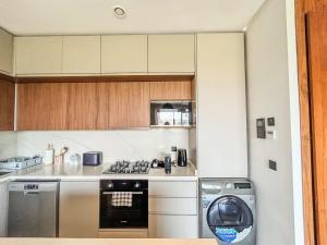 This apartment features one bedroom along with a kitchen equipped with a stovetop, refrigerator, dishwasher, oven, and kitchenware. The living area includes a seating space and flat-screen TV. The bathroom contains a walk-in shower. Guests also benefit from a dressing room and laundry amenities such as an iron and drying rack.