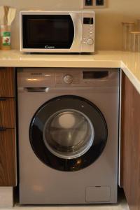 The apartment features one bedroom and a living area equipped with a flat-screen TV with cable channels. Its fully equipped kitchen includes an oven, microwave, stovetop, refrigerator, and washing machine. Guests benefit from linens, towels, heating during colder seasons, and a private entrance for added privacy.