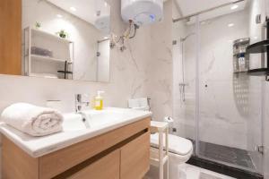 The apartment features a fully equipped kitchen with a refrigerator and coffee machine, alongside a dining area and seating space that includes a sofa and flat-screen TV. A balcony extends from the living area. The bathroom offers either a shower or bathtub with soap provided.