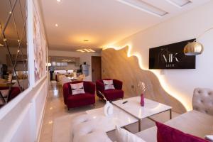 The apartment includes a fully equipped kitchen featuring an oven, microwave, stovetop, and refrigerator for convenient meal preparation. It also provides a washing machine and a flat-screen TV in the seating area. Guests can enjoy direct access to the attached balcony overlooking the surroundings.