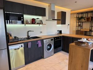 The apartment includes a fully equipped kitchen with a minibar, allowing guests to prepare meals at their convenience. The living area features a flat-screen TV and heating for added comfort. A washing machine is available within the unit, supporting extended stays or laundry needs. A crib can be provided upon request.