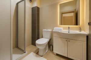 Inside, the air-conditioned apartment features two bedrooms, a living room with a sofa bed, and two bathrooms equipped with walk-in showers and free toiletries. The fully equipped kitchen includes a stovetop, oven, refrigerator, and coffee machine. Guests can enjoy city views from the balcony or relax in the seating area while watching streaming services on the flat-screen TV. Additional conveniences include bed linen, towels, non-feather pillows, a washing machine, and individual temperature control.
