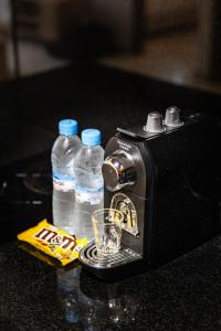 The air-conditioned unit features one bedroom with two beds over two metres long and includes a kitchenette equipped with an oven, stovetop, toaster, refrigerator, and coffee machine. The living area offers city views through the window and contains a seating area with a sofa, dining table, flat-screen cable TV, and complimentary bottled water. The bathroom provides both a walk-in shower and bathtub along with free toiletries.