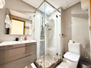 The apartment features two separate bedrooms along with two bathrooms equipped with walk-in showers and bidets. Guests can prepare meals in the kitchen that includes an oven, stovetop, refrigerator, and kitchenware. The living area has air conditioning, heating, soundproof walls, a flat-screen TV, seating space, dining area, washing machine, and a balcony overlooking the city.