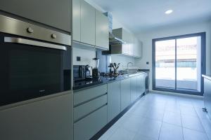 The spacious apartment includes three separate bedrooms and two bathrooms equipped with showers and bidets. A fully equipped kitchen provides a stovetop, refrigerator, dishwasher, coffee machine, tea maker, and kitchenware for meal preparation. The living area has a seating space alongside a flat-screen TV with streaming services and an online movie player. Additional amenities include a washing machine, laundry service, feather and non-feather pillows, bed linen, towels, cribs for young children, heating throughout the apartment, tile or marble flooring in the living area, and soundproof walls.