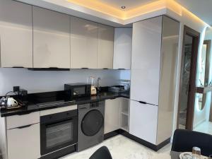 The spacious unit includes one bedroom with heating and non-feather pillows, a living room with a flat-screen TV and seating area, and an equipped kitchenette featuring an oven, microwave, stovetop, refrigerator, tea and coffee maker. The bathroom has a shower and hairdryer. Guests can use the washing machine, ironing facilities, clothes drying rack, and enjoy free Wi-Fi throughout the property.