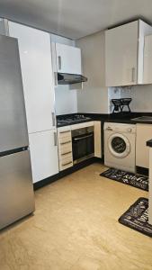 The apartment includes one bedroom with two beds and soundproof walls for added privacy. Guests can enjoy a fully equipped kitchen featuring a stovetop, oven, microwave, toaster, fridge, washing machine, and essential kitchenware. The living area offers a flat-screen TV with streaming services alongside seating on a sofa. The bathroom has a shower and dressing room.