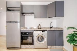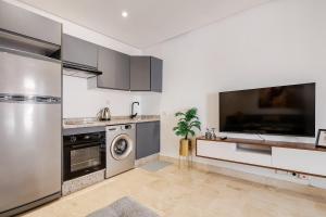 The air-conditioned unit includes one bedroom, a fully equipped kitchen for meal preparation, and a seating area with a flat-screen TV. Guests can use the washing machine provided in the apartment.