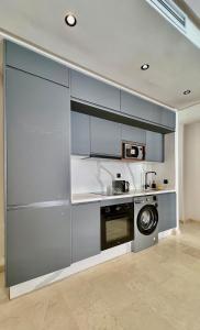 The apartment features one bedroom, a fully equipped kitchen for cooking and food storage, and a bathroom. The living area includes a flat-screen TV and heating elements. Guests also have access to a washing machine within the unit.