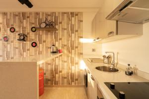 The apartment includes one bedroom with linens, a seating area with a sofa, and a flat-screen TV with satellite channels. The fully equipped kitchen contains an oven, toaster, refrigerator, washing machine, coffee station, and facilities for drying clothes. A balcony extends the living space outdoors.