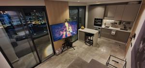 This one-bedroom apartment includes air conditioning throughout, a kitchen equipped with an oven, stovetop, and refrigerator, plus a washing machine. The living area features a flat-screen TV and seating space for relaxation. The bathroom is fitted with a shower and stocked towels.
