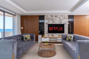 The apartment features two bedrooms and three bathrooms, accommodating guests with bed linen, towels, and cable TV. The fully equipped kitchen includes a stovetop, refrigerator, dishwasher, and kitchenware. A washing machine is provided for added convenience. Guests can enjoy the fireplace or relax on the patio overlooking the sea while making use of the barbecue area outdoors.