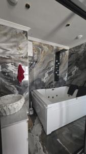 The spacious apartment includes a kitchen equipped with a refrigerator, dishwasher, oven, and kitchenware. It features two bathrooms with both a hot tub and bathtub, plus an additional shower. The living area has a flat-screen TV alongside seating and dining spaces. Guests benefit from a walk-in closet, dressing room, clothes rack, bathrobe, towels for the pool area, and access to parking on the premises.
