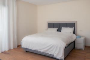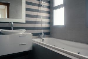 Each apartment includes a private entrance, multiple bedrooms, and bathrooms with both a bathtub and shower. Guests can prepare meals in the fully equipped kitchen that contains a stovetop, refrigerator, dishwasher, oven (in some units), and kitchenware. The living areas provide seating with sofas and flat-screen TVs. A terrace overlooking the sea extends from each unit.