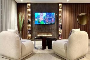The apartment includes three bathrooms, a living area with a fireplace, and a fully equipped kitchen featuring a stovetop, microwave, dishwasher, refrigerator, and barbecue. It also provides air conditioning throughout the unit along with heating for comfort. Entertainment needs are met by a TV with cable channels and free Wi-Fi is accessible in all areas.