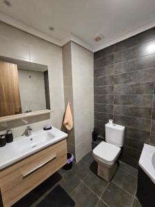 The air-conditioned apartment includes two bedrooms, two bathrooms with both a bath and shower, and an open living area containing a flat-screen TV with streaming services. Guests can prepare meals in the fully equipped kitchen offering an oven, stovetop, refrigerator, and coffee machine. A dining area complements the space along with seating options including a sofa. The unit provides bed linen, towels, hypoallergenic pillows, and laundry facilities through a washing machine.