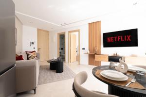 The apartment features one bedroom with two beds and includes a kitchen equipped with an oven, stovetop, refrigerator, and kitchenware for meal preparation. The living area provides seating along with a flat-screen TV that supports streaming services. Guests benefit from free Wi-Fi throughout the property and can enjoy the terrace or step out onto the balcony.