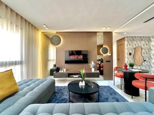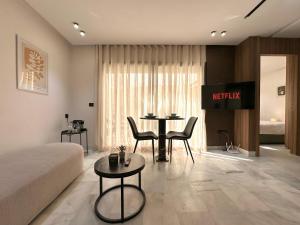 Each apartment includes one living room, a separate bedroom or studio layout, and a bathroom equipped with a shower, bidet, hairdryer, free toiletries, and bathrobes. Kitchens come fully equipped with an oven, stovetop, refrigerator, dishwasher, coffee machine, kettle, and dining area. Living spaces have parquet floors and seating areas furnished with flat-screen TVs. Washing machines are available within the units for guests' convenience.