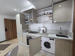 The apartment includes a fully equipped kitchen for cooking and food storage, alongside a seating area with a flat-screen TV. The bathroom serves the single-bedroom unit, which also provides heating and a washing machine for guest convenience.