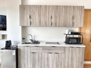 The apartment features one bedroom and a bathroom equipped with both a bath and walk-in shower. The fully fitted kitchenette includes a stovetop, refrigerator, microwave, toaster, kitchenware, coffee machine, and kettle. A seating area complements the space alongside a flat-screen TV providing cable channels and streaming services.