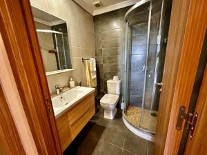 The apartment includes three bedrooms furnished with beds longer than two metres, alongside two bathrooms and a seating area featuring a sofa. Air conditioning and heating controls ensure comfort throughout the year. The living room connects to a kitchen equipped for cooking and storage, while entertainment options include a flat-screen TV with streaming services.