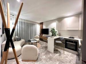 This one-bedroom apartment includes a fully equipped kitchen for cooking and food storage, a private bathroom, and a TV in the living area. The unit is non-smoking throughout.