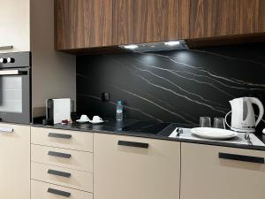 The apartment features a separate living room equipped with a flat-screen satellite TV and seating area. The kitchen includes a refrigerator, electric kettle, and tea and coffee maker for meal preparation. The bathroom has a walk-in shower and bidet, while the unit also contains a washing machine. Accommodation includes two beds in total.