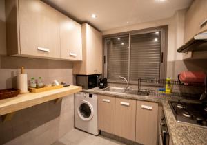 Each apartment features two separate bedrooms, a living room, and two bathrooms equipped with both a shower and bathtub. The well-equipped kitchen includes an oven, stovetop, refrigerator, microwave, coffee machine, and electric kettle. Air conditioning ensures comfort throughout the units while flat-screen TVs with streaming services provide entertainment. Additional conveniences include a washing machine, dining area, private entrance, desk workspace, wardrobe or closet space, slippers for guests’ use, bathrobes provided in the bathroom along with free toiletries.