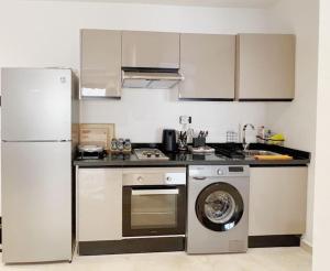 The apartment features a living room with a flat-screen TV and a fully equipped kitchen that includes an oven, stovetop, refrigerator, and tea/coffee maker. The bedroom provides three beds with linens and towels supplied. A private bathroom contains a hairdryer and soap.
