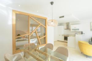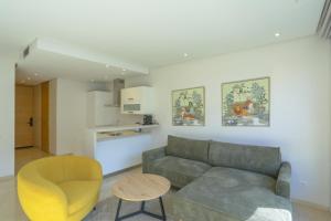Each apartment includes a living room and one or two separate bedrooms, equipped with flat-screen TVs featuring streaming services. Kitchens come with stovetops, refrigerators, ovens, kitchenware, tea and coffee makers. Dining areas are complemented by seating spaces that include sofas. Bathrooms have showers and hairdryers, towels and bed linens are provided.