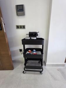 The spacious apartment includes one living room, one separate bedroom with two beds, and a bathroom equipped with a shower, bidet, hairdryer, and complimentary toiletries. The fully equipped kitchen contains an oven, stovetop, microwave, refrigerator, toaster, coffee machine, kettle, and kitchenware for self-catering needs. A seating area with satellite flat-screen TV overlooks the city from the balcony.