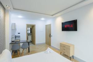 This one-bedroom apartment includes a living room, a private bathroom with a hairdryer, and a kitchen equipped with an oven, refrigerator, microwave, and kitchenware. Guests have access to streaming services on the flat-screen TV and can prepare meals using the tea and coffee maker provided. A washing machine is also available for convenience.