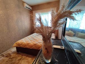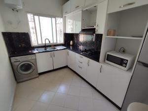 The apartment includes one bedroom, a bathroom with a hot tub, and a fully equipped kitchen for meal preparation. The living area features a flat-screen TV, and guests have access to a washing machine within the unit.