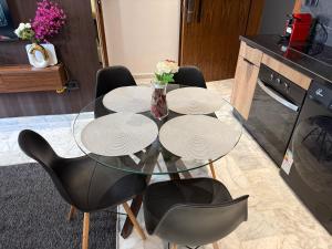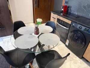 The one-bedroom unit accommodates guests with two beds, including a sofa bed for additional sleeping arrangements. The fully equipped kitchen includes a stovetop, oven, refrigerator, and coffee station. The living area provides a flat-screen TV and seating at the dining table. Laundry needs are met with a washing machine and tumble dryer available on-site.