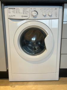 The apartment features a fully equipped kitchen with kitchenette facilities, ideal for cooking and food storage. Guests can relax in the seating area furnished with a sofa and enjoy entertainment via the flat-screen TV. The unit contains three beds over two meters long, complemented by a dressing room and washing machine for added convenience. The bathroom has a shower, bidet, soap provision, and features tile or marble flooring alongside hardwood or parquet floors throughout most of the interior.