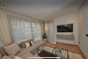 The apartment includes a fully equipped kitchenette featuring an oven, stovetop, microwave, and refrigerator. Guests will find a washing machine and flat-screen TV in the seating area. The bathroom provides towels, toiletries such as shampoo and soap, and a hairdryer. Linens are supplied for the bed.