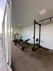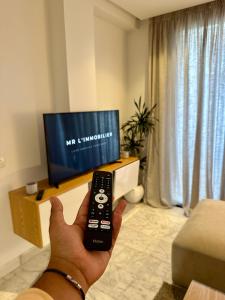The apartment features one bedroom with two beds, a fully equipped kitchen for cooking needs, and a bathroom. Entertainment options include a flat-screen TV situated in the seating area. Guests can also use the washing machine provided within the unit.