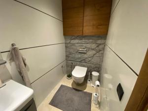 The apartment includes one bedroom with two beds and features a kitchen equipped with a stovetop, refrigerator, dishwasher, oven, microwave, and kitchenware for meal preparation. The living area has a flat-screen TV with streaming services and seating space. There are two bathrooms fitted with walk-in showers and an additional toilet. Guests also benefit from heating throughout the indoor areas and amenities such as slippers, bathrobe, non-feather pillows, towels, bed linen, ironing facilities including an iron service on request.