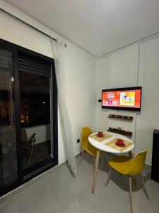 The apartment includes two beds, a dining area, and a fully equipped kitchen with an oven, stovetop, refrigerator, and kitchenware. For convenience, there is also a washing machine. The living space features free Wi-Fi throughout and entertainment via a flat-screen TV.