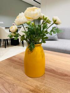 Inside, the apartment features a fully equipped kitchen suitable for meal preparation and storage. The living area includes a flat-screen TV, while climate control is ensured by both air conditioning and heating systems. A washing machine is provided to support extended stays.