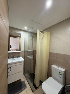 The apartment includes two bedrooms, a living room with a flat-screen TV, and a kitchen equipped for cooking and food storage. Guests can also use the washing machine available inside the unit.