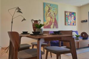 The apartment features one bedroom, a separate living room with a flat-screen TV, and two bathrooms equipped with walk-in showers. Guests can enjoy meals in the dining area adjacent to a fully equipped kitchen that includes a dishwasher, oven, microwave, stovetop, refrigerator, and electric kettle. A terrace extends from the unit providing outdoor space overlooking the garden.